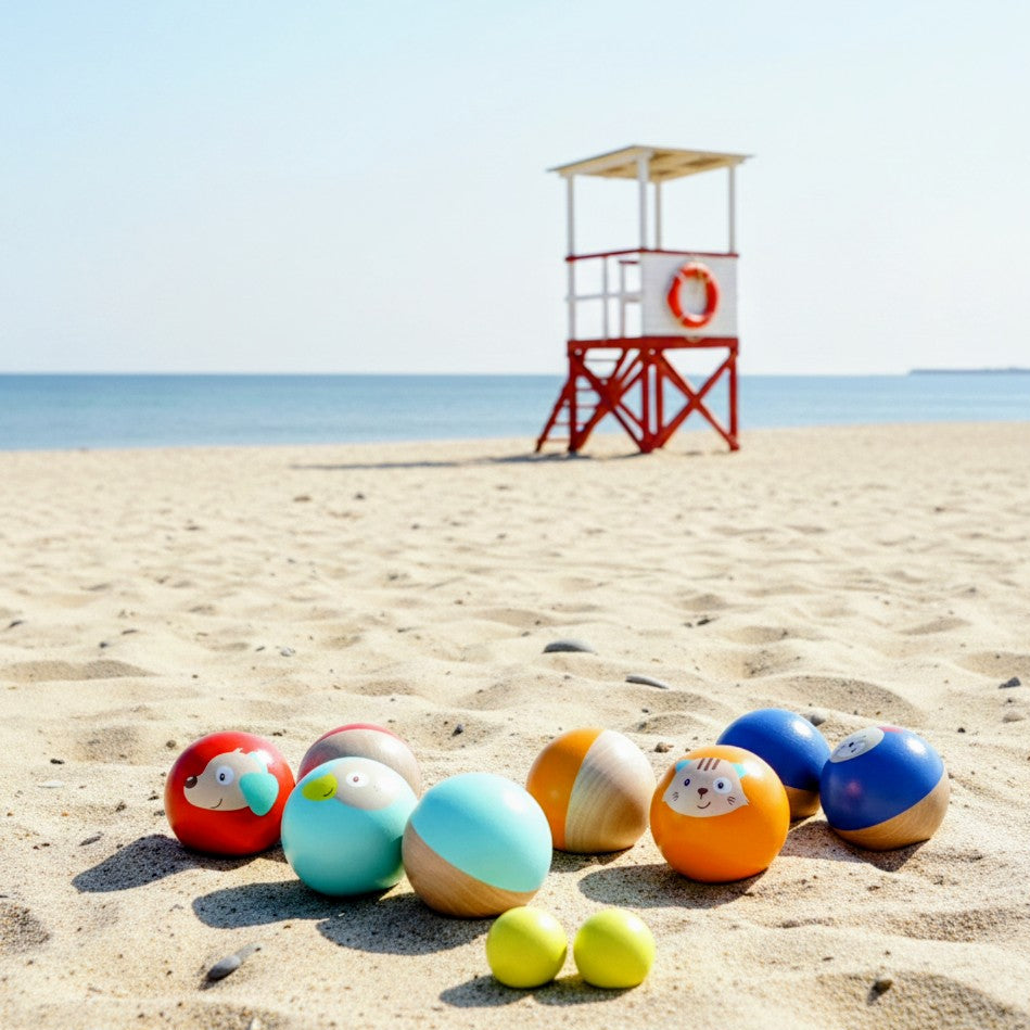 Et klassisk kuglespil i træ – inspireret af boccia og petanque, men tilpasset børn og familier. Målet er enkelt: Kast dine kugler tættest på den mindre målkugle kaldet gris, og dyst mod hinanden i præcision og overblik.