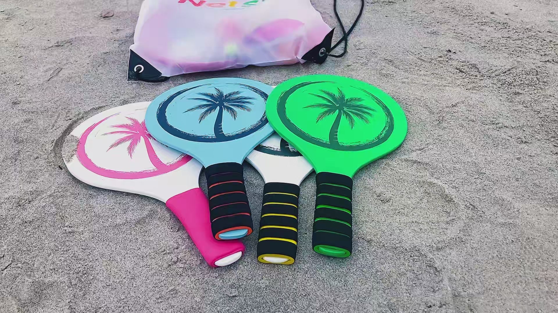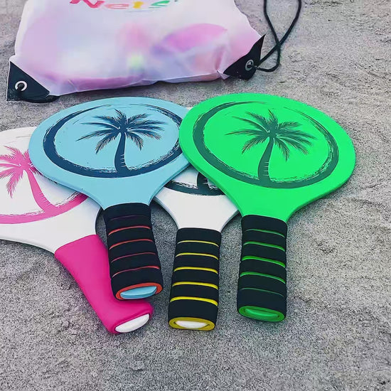 Get ready for Beach Games with our complete Beachball bat set 4 pieces Palm ocean in blue, white, pink and green colors. Perfect for the beach, The light and reactive Palm bat provides maximum control and fast duels, while the soft foam grip ensures a comfortable grip for both children and adults. A total of 3 new rubber balls are included!