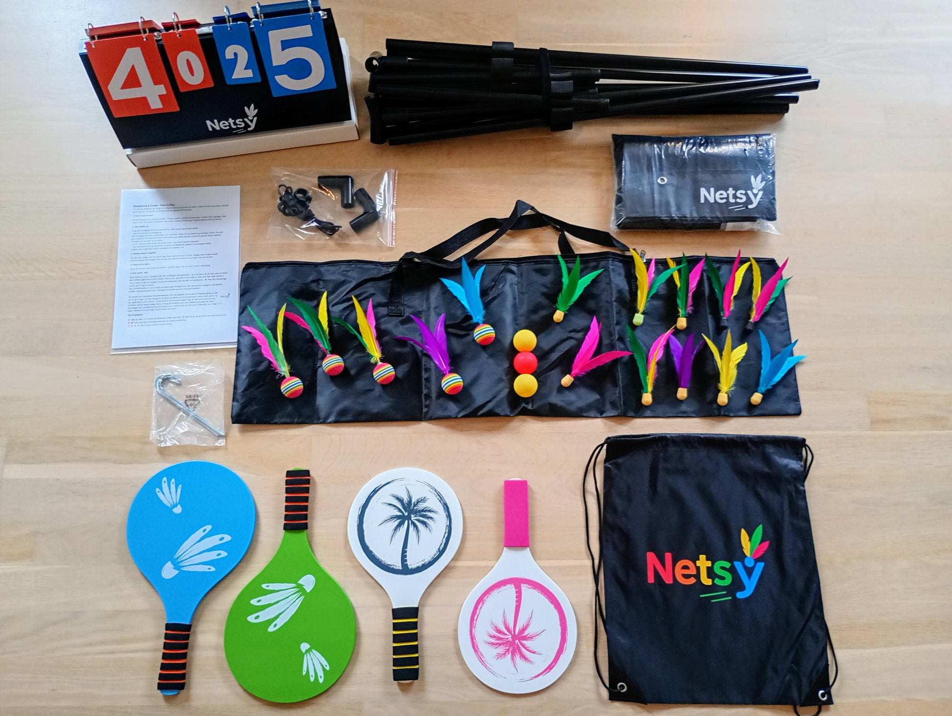 Nordic Batgame is inspired by beach tennis, badminton, pickleball and table tennis, and still a completely new experience. Here you get the Premium game set. Play in the garden, in the hall, on the beach, in the park, in the living room or on holiday. Lots of equipment for several players, and all year round, as well as the official rules of the game and Danish assembly instructions. Premium includes. net, metal frame, pegs for wind protection, a nice scoreboard for the intense matches with rules of the game, 4 bats, 3 unique balls (rubber) and a whole 15 shuttlecocks! So friends, children and family can join in - and there are plenty of shuttlecocks, several of which are uniquely colored, for the whole year. In the included Gearbag, bats, balls and shuttlecocks can be stored, and the entire game set in the included storage/transport bag. That's Premium. See the list of equipment below.